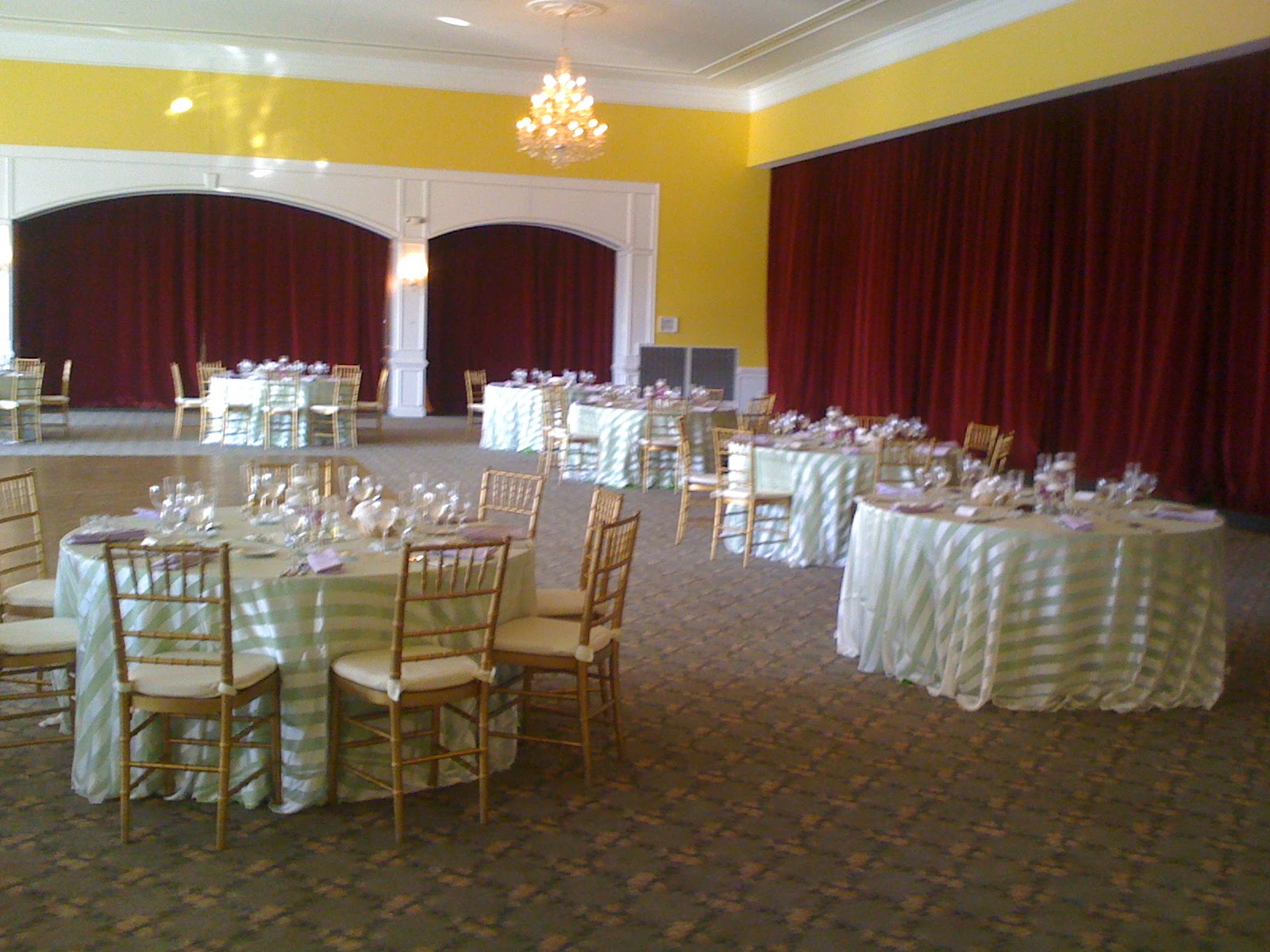 Next the party moved into the grand ballroom for the reception. The bride and groom sat at a sweetheart table at the head of the room. While the guests sat at tables which were draped in apple green linens with white striped overlays. The centerpieces were cylinder vases filled with orchids and topped with floating candles. The guests were treated to a plated dinner by Catering by Uptown, which consisted of several courses and included such items as beef tenderloin and macadamia encrusted sea bass. After dinner the evening was filled with dancing to the music of a live band, and the cutting of a beautiful 3 tiered wedding cake. The event was beautiful and we wish the bride and groom a wonderful and joyous marriage!
