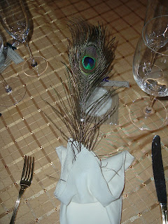 The grand ballroom was decorated with tables in gold stripes with cream napkins and peacock feathers in each napkin. Each place setting had a favor in front of the napkin. Every table was decorated with a different floral centerpiece. Some had tall cylinder vases filled with water with tall blue flowers and peacock feathers and others had smaller vases filled with water and purple round flowers.